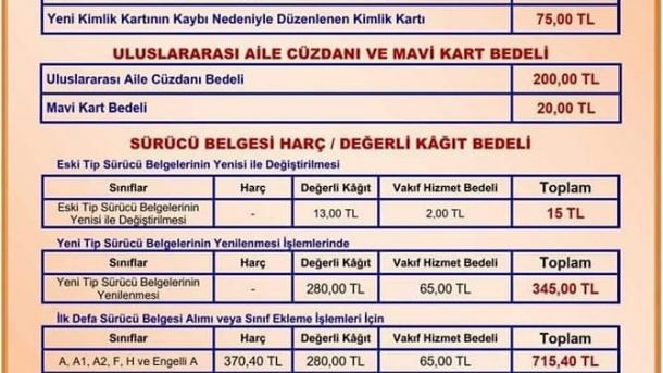 B Sınıfı Ehliyet Harç Ücreti 1461,90 TL., A2 - A Sınıfı Ehliyet Harç Ücreti 715,40 TL.